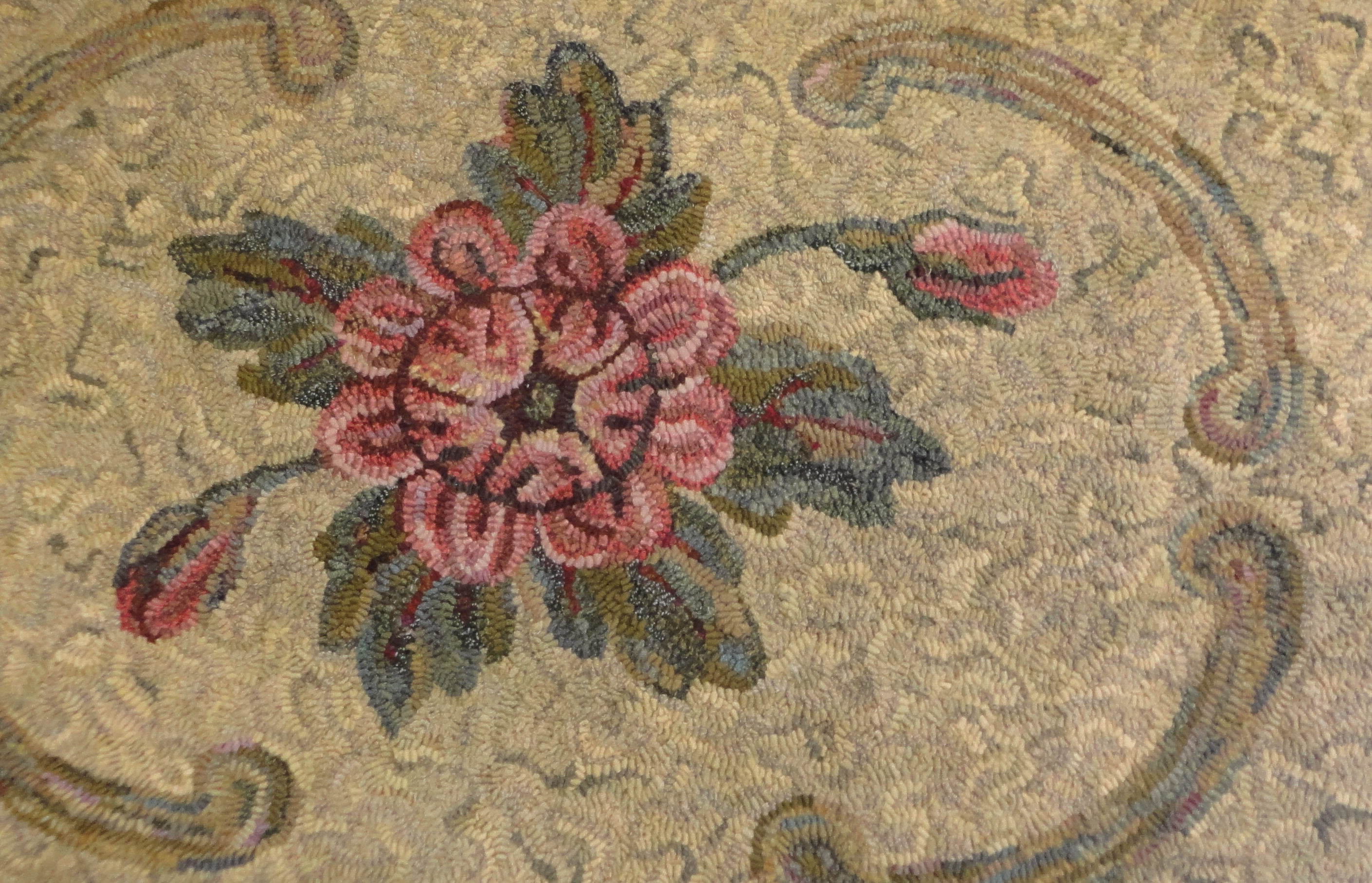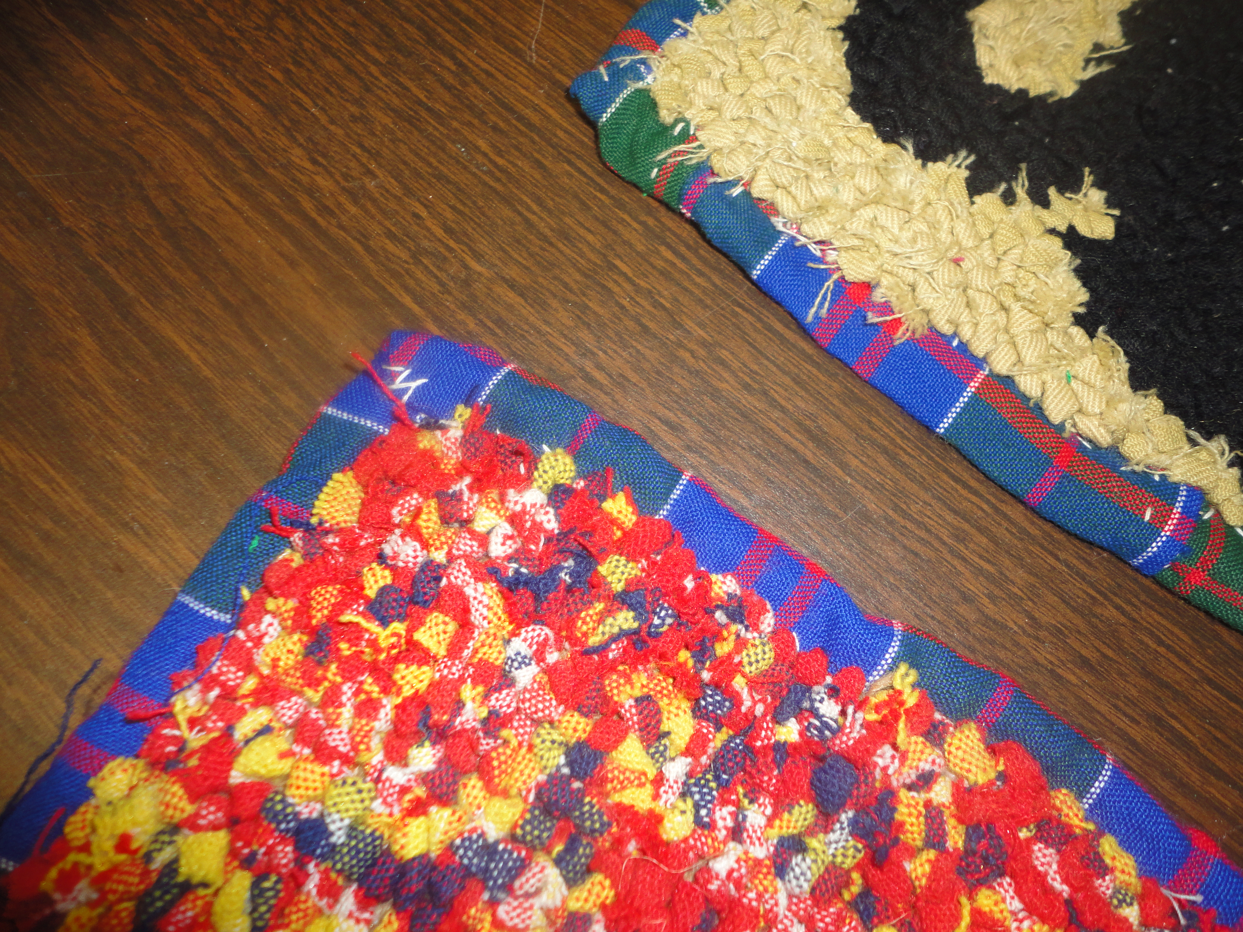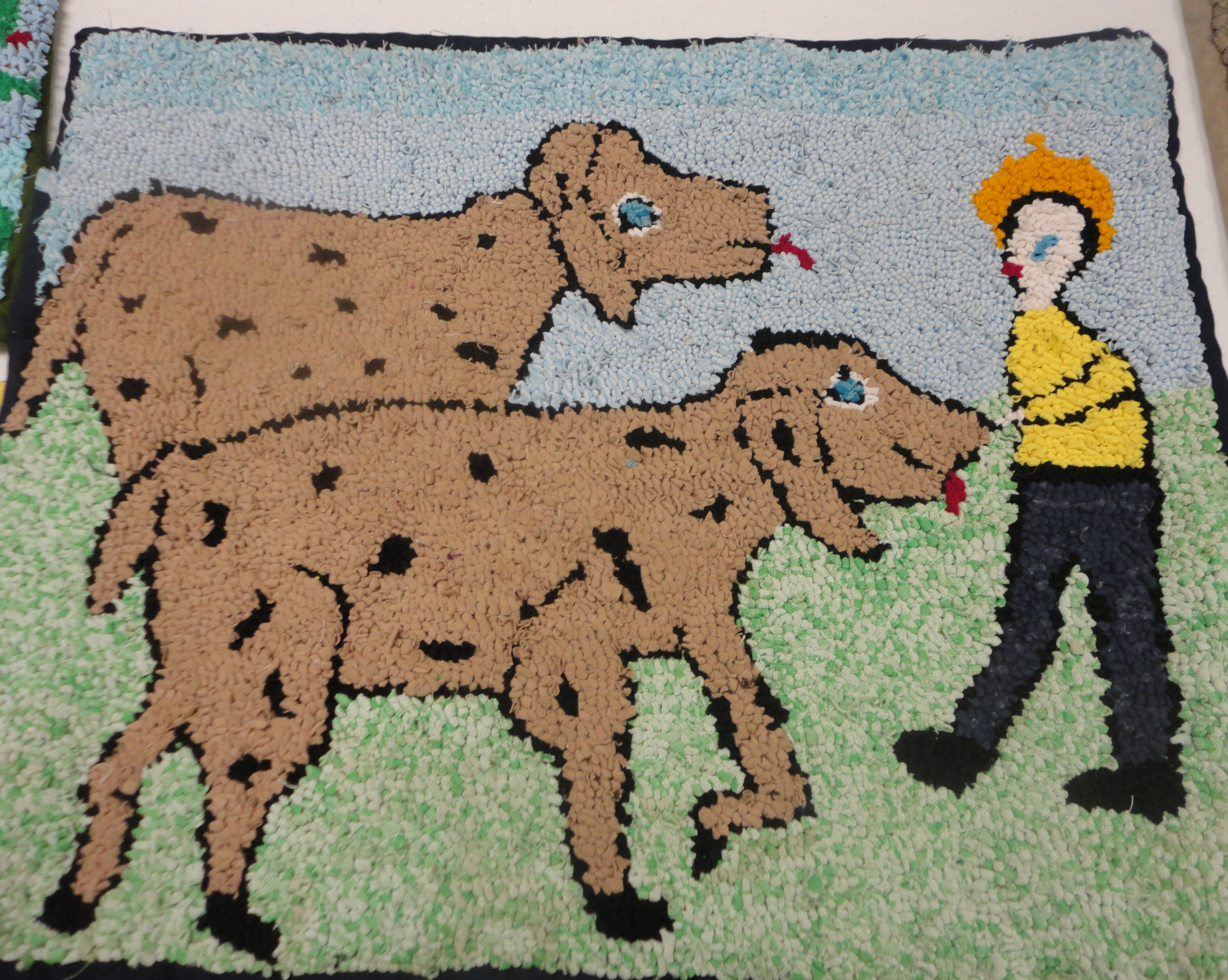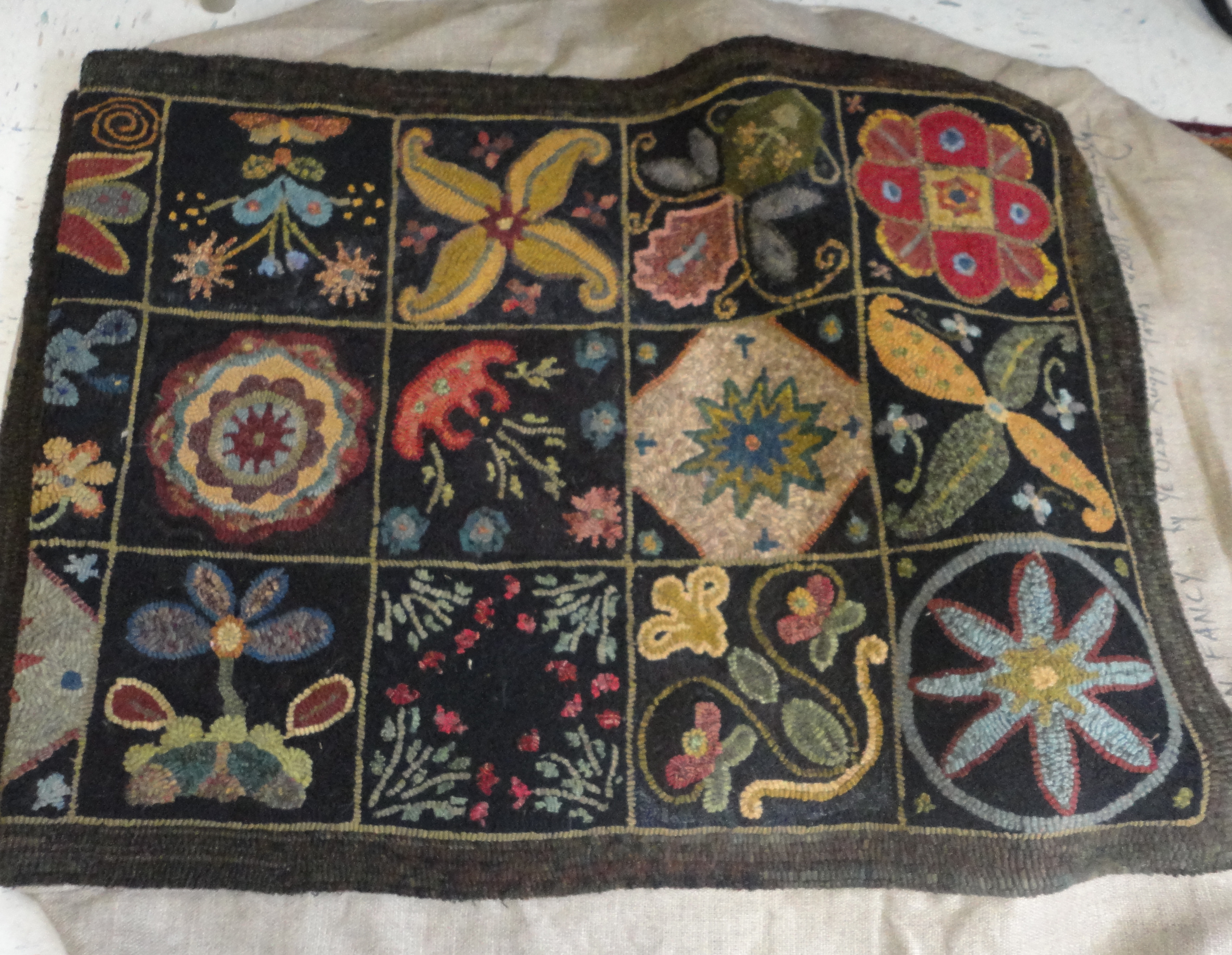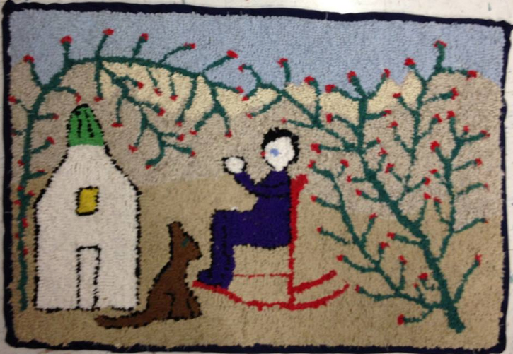 John recalls this rug as being inside the door of Ellen’s home. The family used their rugs throughout the house, but also hooked over the winters to have rugs to trade for linoleum mats/rugs. Interesting how they saw more value in the linoleum than their hand-made pieces.