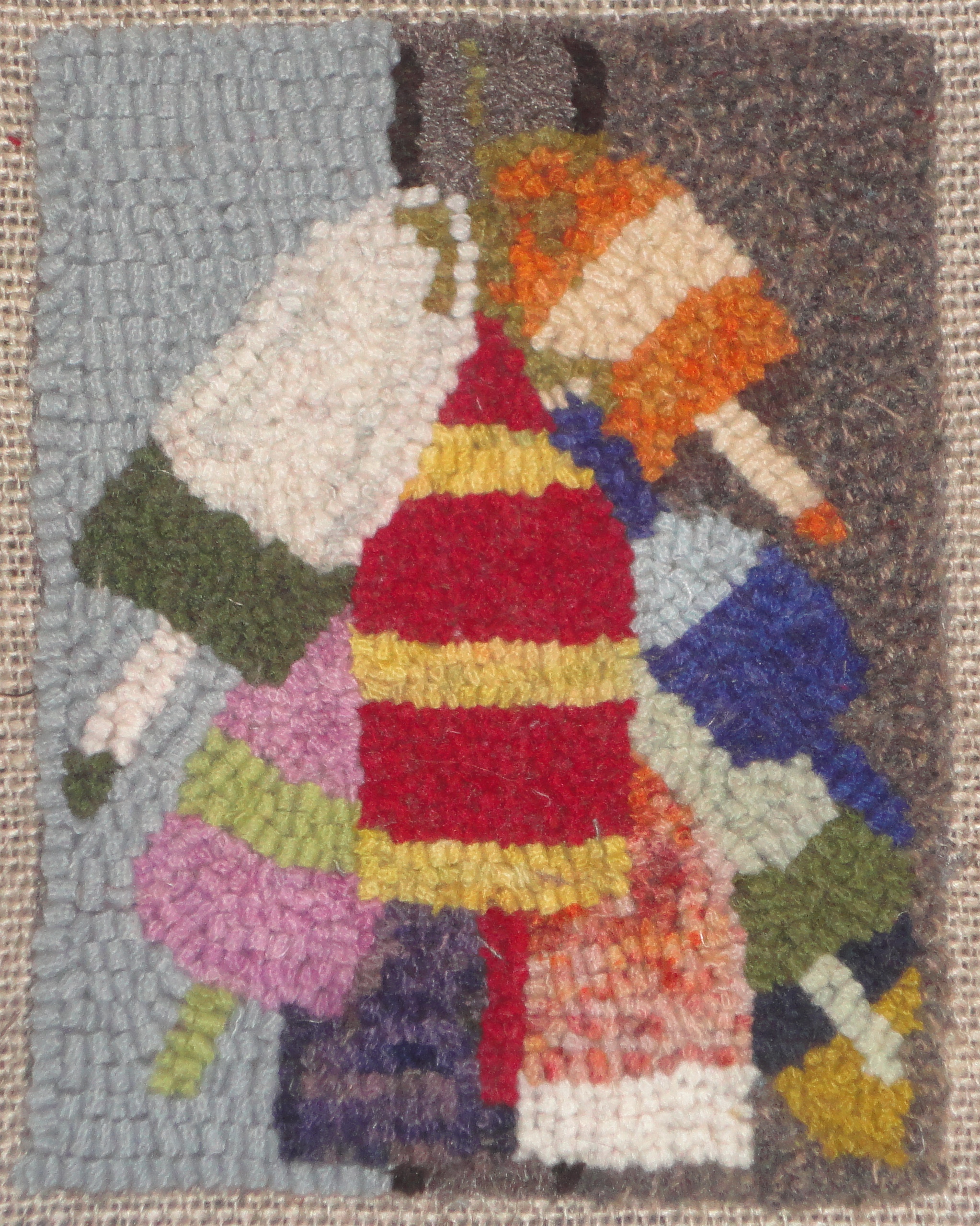 The hooking with very small cuts took a little getting used to, but figured it out enough. Not working with a design that needed too much detail the buoys worked up in good time. Then the trouble happened. As you can see from the design I figured the buoys to be hanging on a cedar shaker sided shed – grays and blacks to depict each shake. This would give a simple texture to the background. Good idea, but not one I could get to work. I tried my grays and black. Pulled the black and tried dark gray tweed. Pulled that and tried dark brown. Pulled it all and rethought the background. (Now these tries were not just a line or two, but at least half the background. On such a small mat, need to hook an area big enough to see what is happening and that means most of it.) 🙂